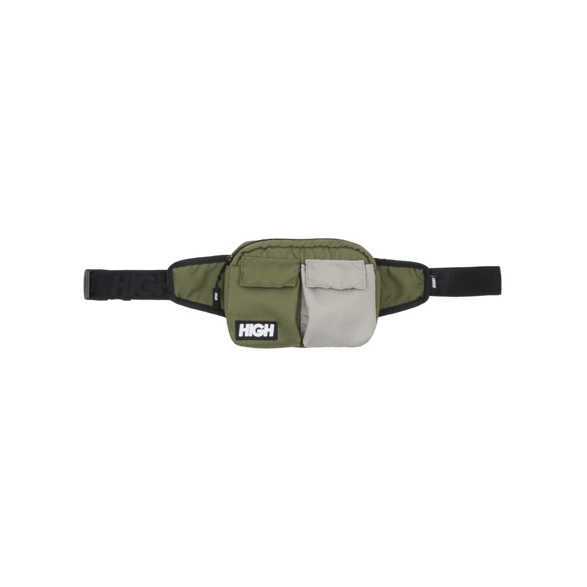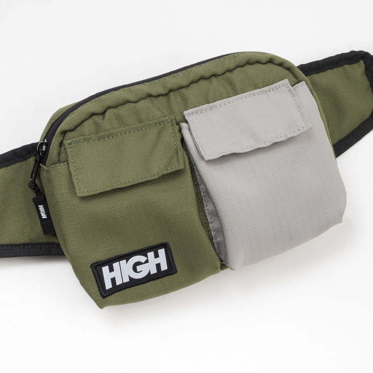 Pochete de ripstop com 3 bolsos, fita personalizada e etiquetada.